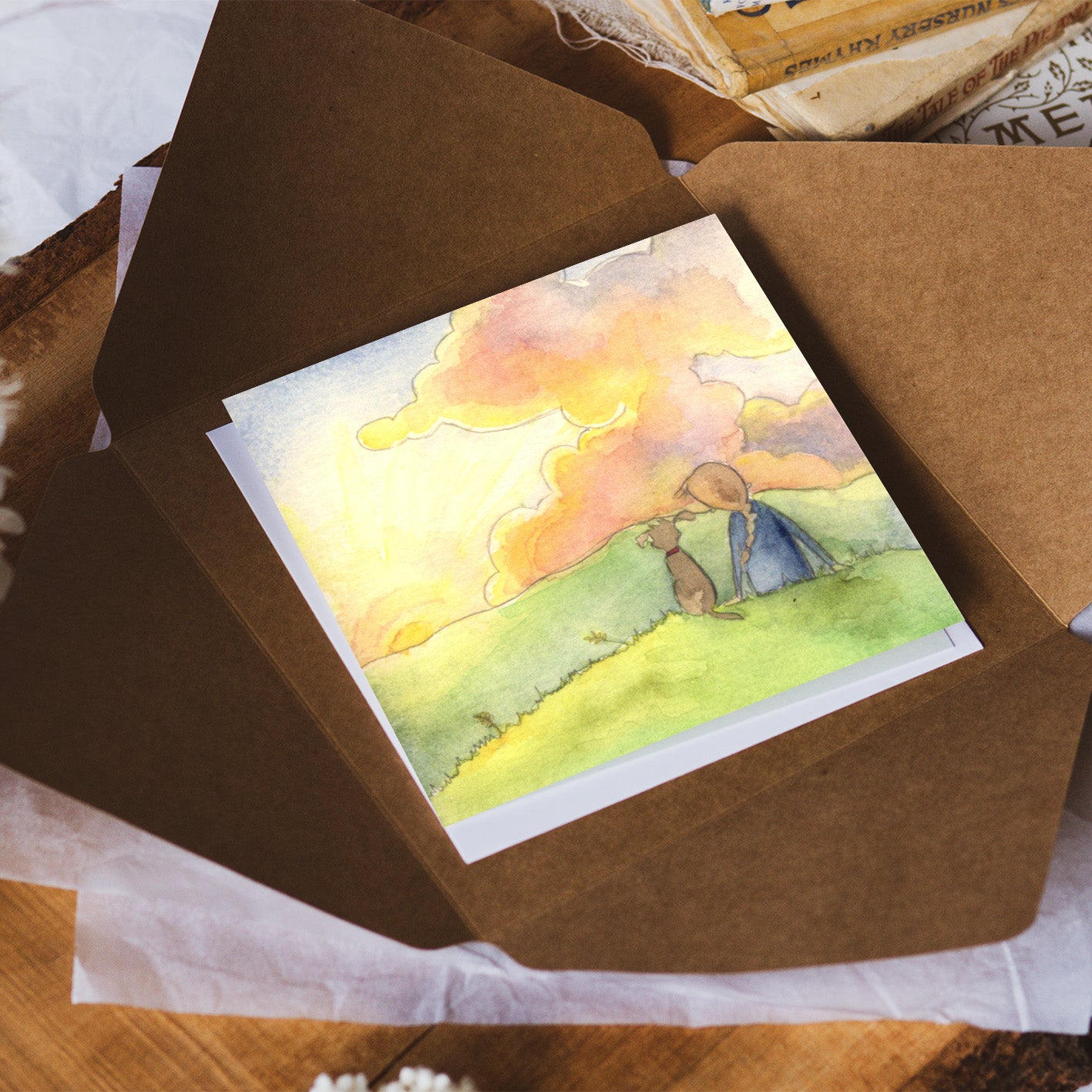 Looking at the card with the girl and dog watching the sunrise, I crafted this message: