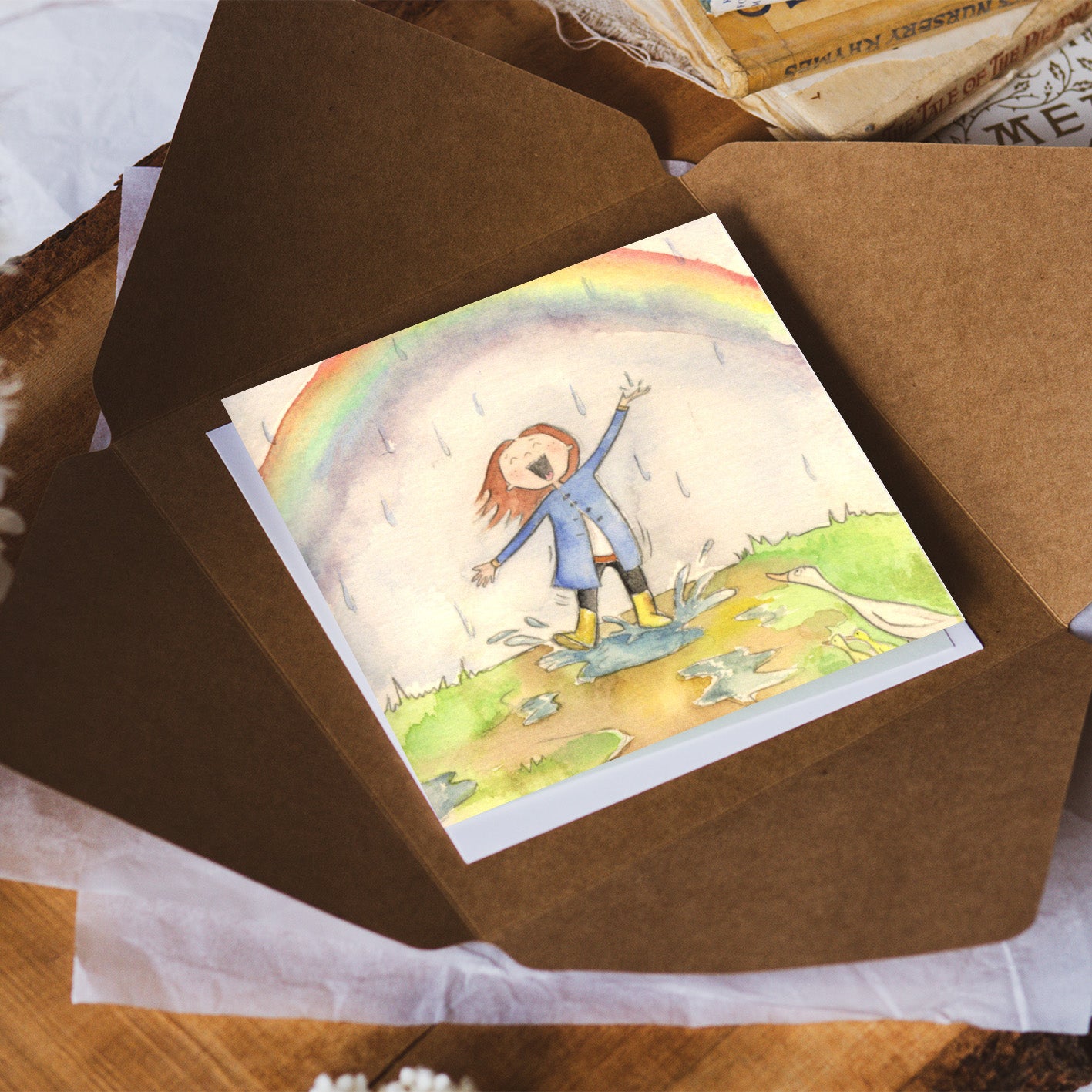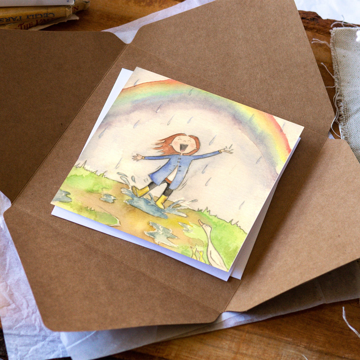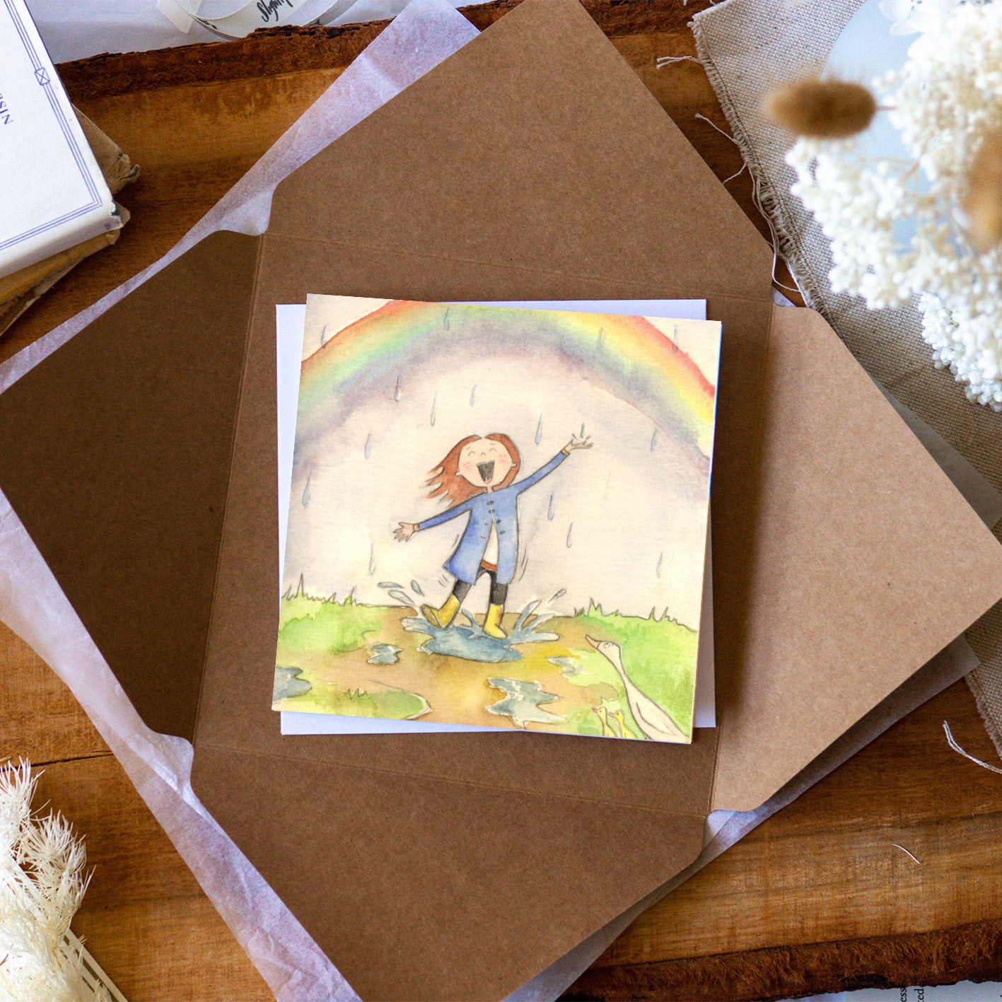 Kick up your boots! Embrace the wild and the innocent with this card of joyous abandon. There is mystery and delight in the all the things that come alive in the rain: the colour, the ducklings, the tiny water creatures.